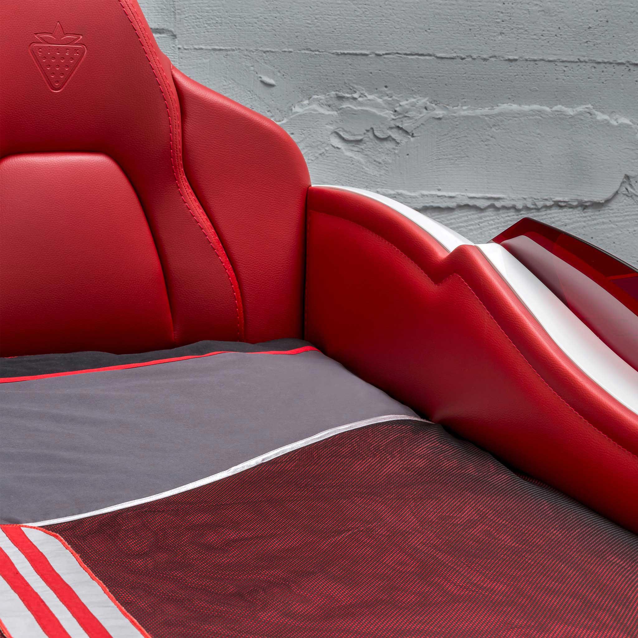 Cozy, Comfy & Safe for Little Racers – Snug vegan-leather headboard, soft interior padding, and window-style guardrails make this carbed cozy and secure. Toy-certified with no sharp edges. Ambient nightlight glow for bedtime calm. Designed for racers aged 3 to 12.